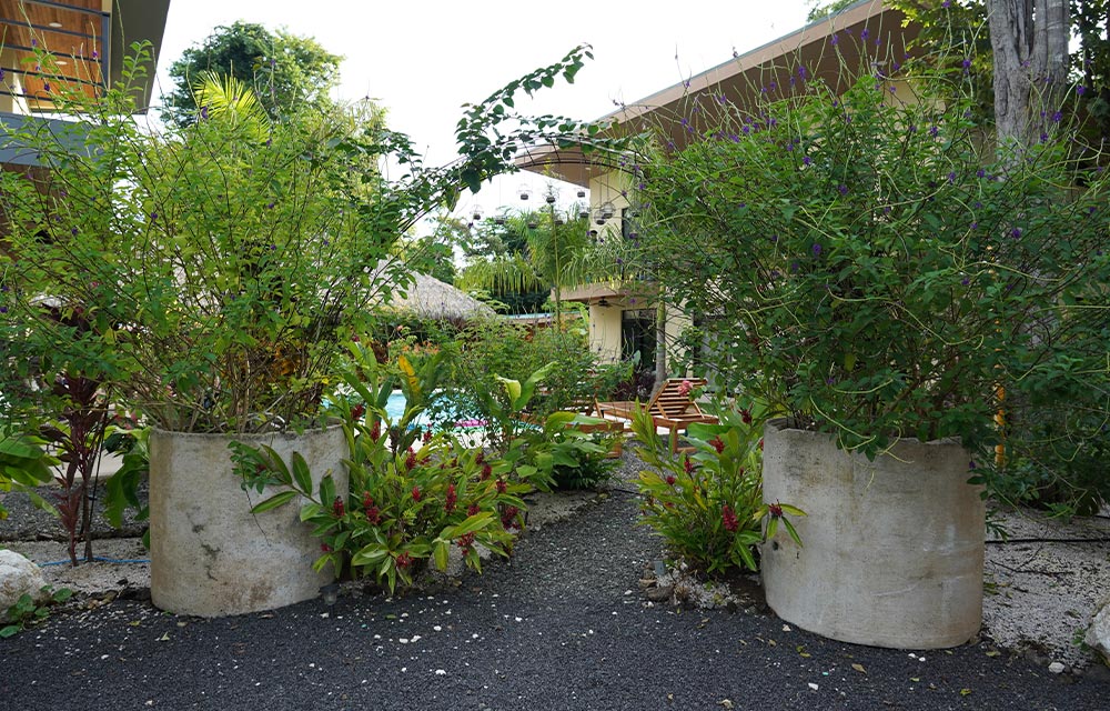 Stone and sand pathways connect the rooms and common areas, guiding visitors through a sensory journey where the textures and sounds of the environment blend together. The use of native species creates a diverse palette that attracts local wildlife —birds, butterflies, and hummingbirds— reinforcing a deep sense of place.